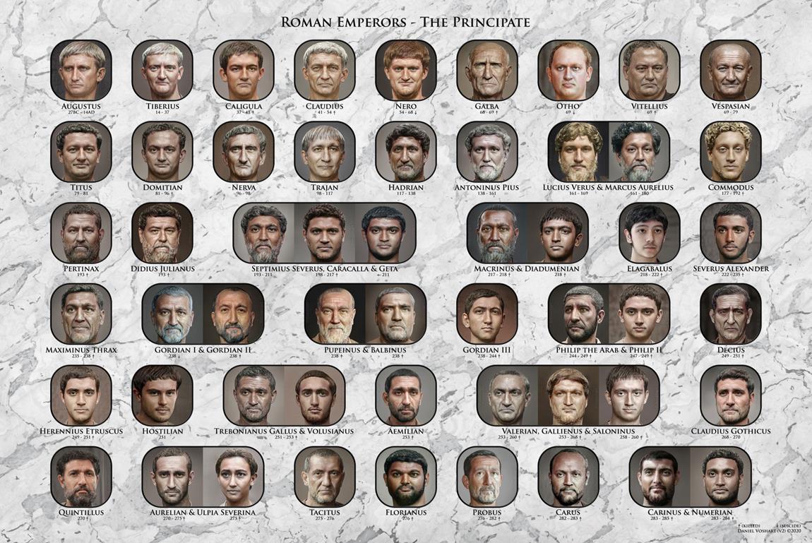 O artista canadense Daniel Voshart realizou um grande projeto de recriação digital dos rostos de imperadores romanos do Principado (27 a.C. a 285 d.C.), começando com Augusto e chegando até Numeriano, o último imperador antes da ascensão de Dioclesiano e do início do Baixo Império.